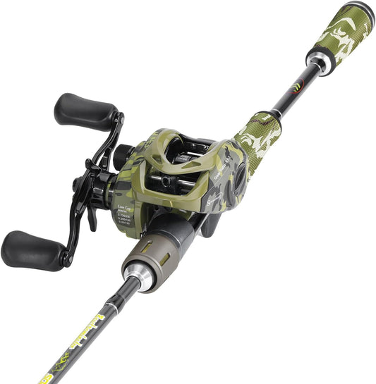 Sougayilang Baitcaster Combo, 30Ton+24Ton Graphite 2-Piece Blanks Casting Fishing Rod,SuperPolymer Handle,“S” Style Hook Keeper with Camo Baitcasting Reel