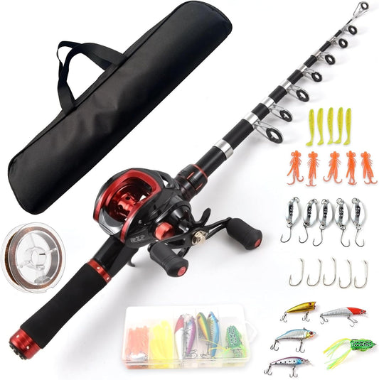 LIXADA Fishing Rod and Reel Combo with Fishing Lures for Adult, 6.89ft/2.1m Telescopic Fishing Rod with Baitcasting Reel 18+1BB Right/Left Hand Portable Fishing Kits Complete for Fishing Trip