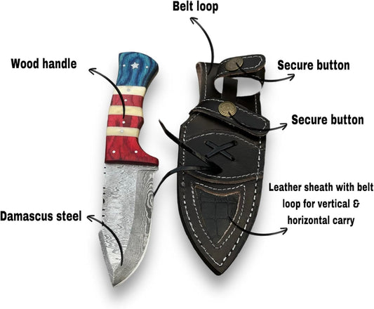 Custom Handmade Damascus Hunting Skinning Knife with Leather Sheath - Ideal for Skinning, Camping, Outdoor - EDC Fixed Blade Bushcraft Knife with Horizontal Carry Knives For Men-1219