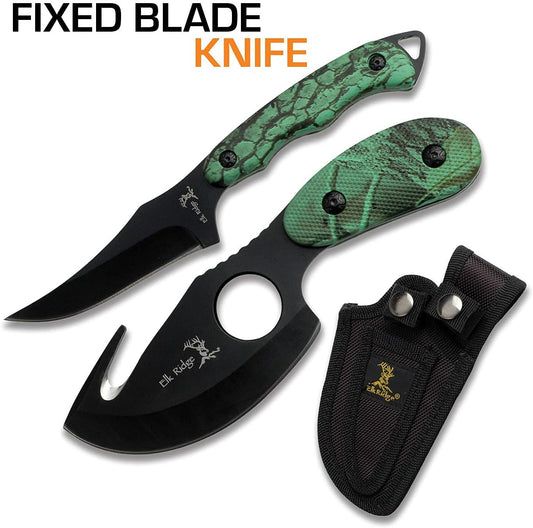 Elk Ridge-Outdoors 2-PC Fixed Blade Hunting Knife Set-Black Stainless Steel Skinner&Gut Hook Blades,Camo Coated Nylon Fiber Handles,Nylon Sheath-Hunting,Survival-ER-300CA,7-Inch/6.5-Inch Overall