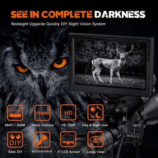 BESTSIGHT Night Vision Scope,DIY Night Vision(Day and Night),Quick Installation Barrle,5" Display Screen with 5w 850nm Infrared Illuminator,View 200m in Night,for 38-44mm Eyepiece Scope (TMNV01P)