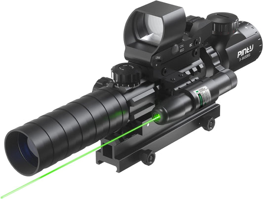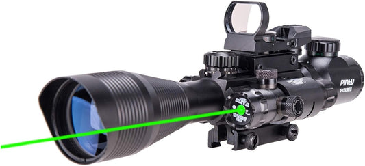 PINTY Rifle Scope Red Dot Laser Combo 4-12x50 Illuminated Optics with 4 Reticle Red Green Reflex Sight, Green Dot Laser Sight