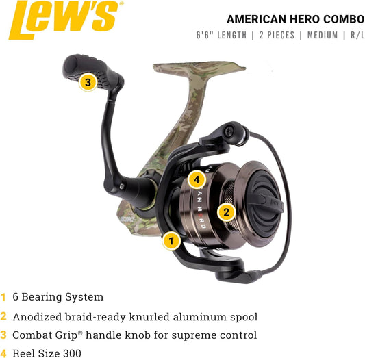Lew’s American Hero Camo Spinning Reel and Fishing Rod Combo, IM7 Graphite Rod, Interchangeable Retrieve, Camo/Black