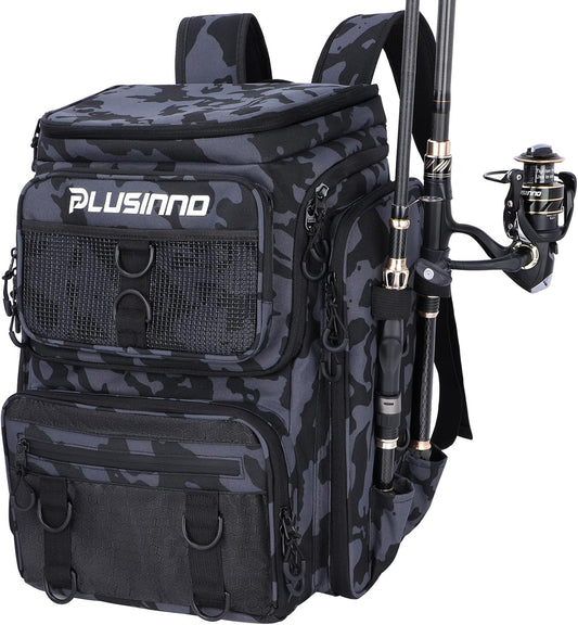 PLUSINNO Fishing Backpack Tackle Bag, Water-Resistant Fishing Backpack with Rod Holder, Ideal Fishing Gifts for Men